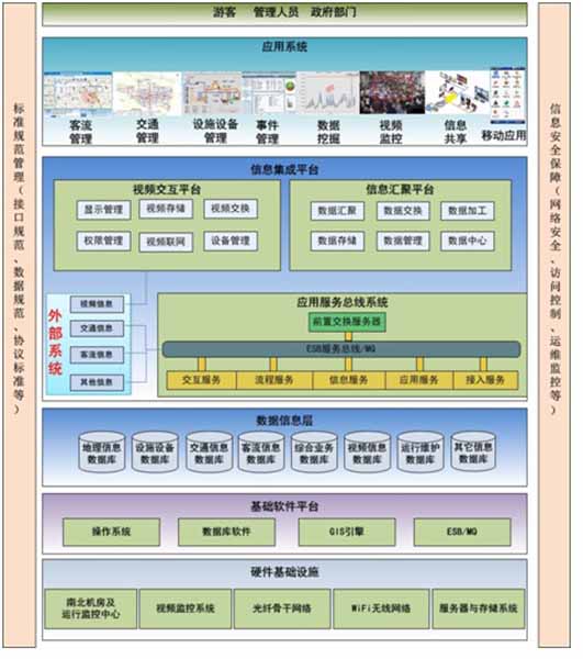 本項目主要建設范圍為上海國際旅游度假區(qū)核心區(qū)7km2范圍(除主題樂園用地部分的公共區(qū)域)的游客服務信息管理系統(tǒng)設計,構筑連接運行監(jiān)控中心與各主要機房、相關設施的主干網(wǎng)絡,為游客服務信息管理系統(tǒng)運行提供基礎通信保障,實現(xiàn)各單體的互聯(lián)互通,實現(xiàn)本系統(tǒng)與其他系統(tǒng)的視頻、運行數(shù)據(jù)等信息交換與共享;設計了運行監(jiān)控中心及南北通信機房,設計了信息集成平臺,實現(xiàn)核心區(qū)域內主題樂園、湖泊邊緣、停車場、軌道交通等各單位的視頻、客流、交通等各類信息的匯聚、抽取、組織與共享管理;圍繞游客服務與管理需求,設計了客流管理、交通管理、設施設備運行監(jiān)控、移動應用、數(shù)據(jù)挖掘、信息共享管理等應用系統(tǒng)。