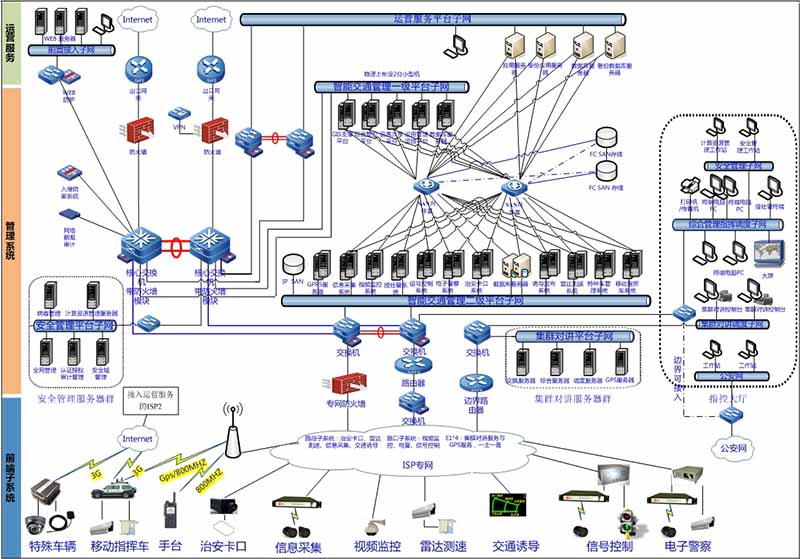 對智能信號控制系統(tǒng)、電子警察系統(tǒng)、治安卡口系統(tǒng)、雷達測速系統(tǒng)、視頻監(jiān)控系統(tǒng)、交通信息采集系統(tǒng)、動態(tài)誘導(dǎo)系統(tǒng)、移動指揮系統(tǒng)、集群對講系統(tǒng)、校車管理、服務(wù)網(wǎng)絡(luò)平臺與設(shè)備管理、中心安全系統(tǒng)、高端運營平臺、接處警平臺、GIS平臺升級、綜合管控平臺升級、指揮控制中心升級以及配合智能交通設(shè)施的路口渠化調(diào)整等20個分部工程開展了工程設(shè)計。