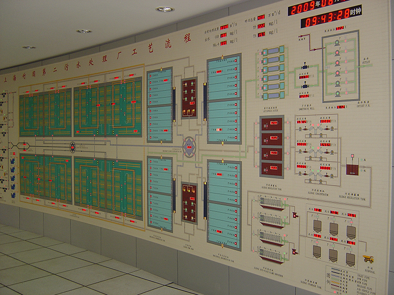 上海竹園第二污水廠設(shè)計(jì)處理能力為50萬(wàn)噸/天,采用專利閉式雙泥齡A/O處理工藝,達(dá)到國(guó)家二級(jí)排放標(biāo)準(zhǔn)。供電系統(tǒng)包括1座35kV變電站、4座6kV變電站;6kV水泵采用變頻調(diào)速,6kV鼓風(fēng)機(jī)采用隨動(dòng)功率因數(shù)補(bǔ)償。自控系統(tǒng)采用精確曝氣控制技術(shù),通過(guò)污染物負(fù)荷在線監(jiān)測(cè)、污泥活性實(shí)時(shí)仿真、曝氣系統(tǒng)優(yōu)化控制等技術(shù)措施,節(jié)約運(yùn)行能耗8~10%。