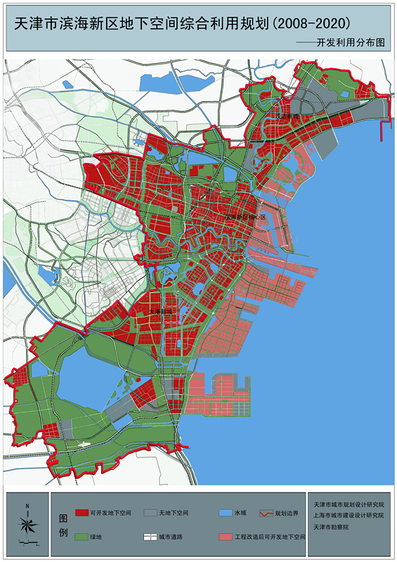項目規(guī)劃面積約為2270km2,以軌道交通為先導(dǎo),重點開發(fā)沿線交通樞紐與城市公共中心,由點、線及面,逐步展開地下空間開發(fā)利用。結(jié)合已建成的津濱輕軌線等大型地下工程,在地下空間建設(shè)大規(guī)模展開之際,編制相應(yīng)的規(guī)劃。