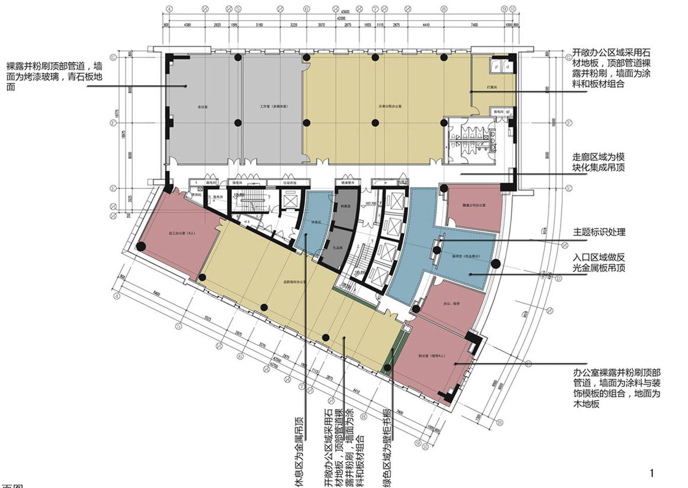 項目位于天津市置地廣場內(nèi)第28層,總面積約1500平方米,設(shè)計目的為創(chuàng)造全新的現(xiàn)代化、人性化辦公空間。根據(jù)樓宇獨特的平面布局和朝向,合理的布置了幾大不同功能的辦公分區(qū),并在必要的位置設(shè)計了各類休閑、接待、員工活動、后勤服務(wù)等輔助空間。設(shè)計中選取現(xiàn)代化簡潔明快的建筑材料,通過金屬與玻璃的組合來增加室內(nèi)空間的明度與透光性,并強調(diào)了室內(nèi)空間序列的可引導性與可識別性;在主入口區(qū)域以醒目的材料和構(gòu)筑方式營造整體空間的主題性。