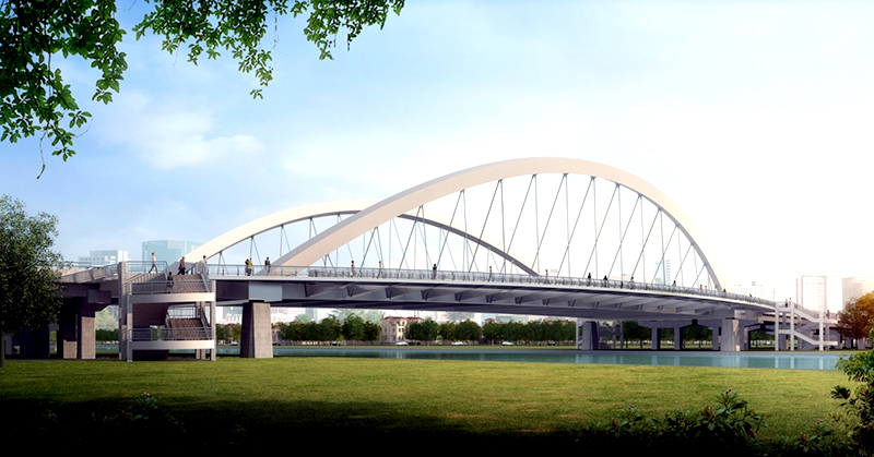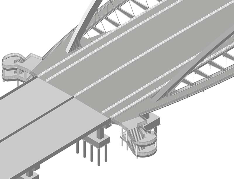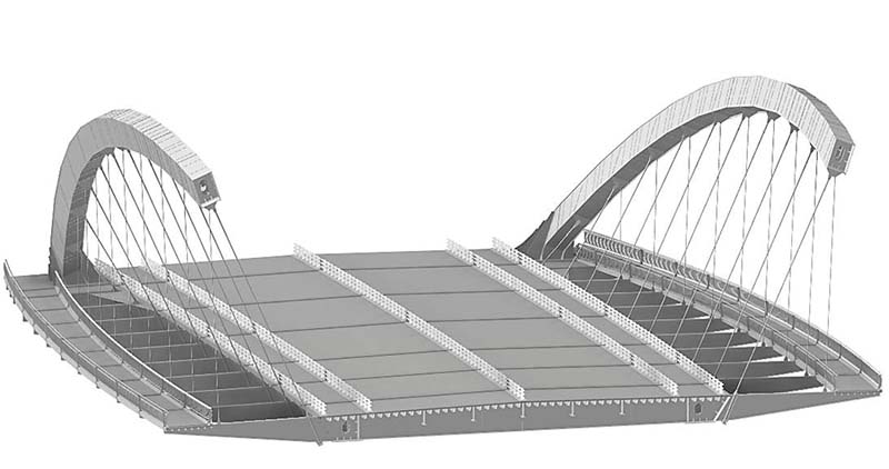 金匯港大橋是奉浦大道道路工程中的重要組成部分,全場(chǎng)432米。主橋?yàn)?6m+100m+16m外傾拱肋下承式系桿拱,全鋼結(jié)構(gòu);引橋?yàn)闁|西兩側(cè)各5X30m共10孔組合小箱梁,結(jié)構(gòu)體系復(fù)雜。本項(xiàng)目的BIM應(yīng)用開展對(duì)BIM應(yīng)用于橋梁鋼結(jié)構(gòu)工程的實(shí)踐與探索,力求建立完整表達(dá)設(shè)計(jì)意圖、真實(shí)反映施工過(guò)程、有序管理施工進(jìn)度的信息共享的平臺(tái),提升項(xiàng)目管理的技術(shù)水平,也為今后類似工程剪力較為完整的操作程序,推動(dòng)BIM技術(shù)的發(fā)展與深化。