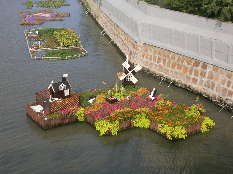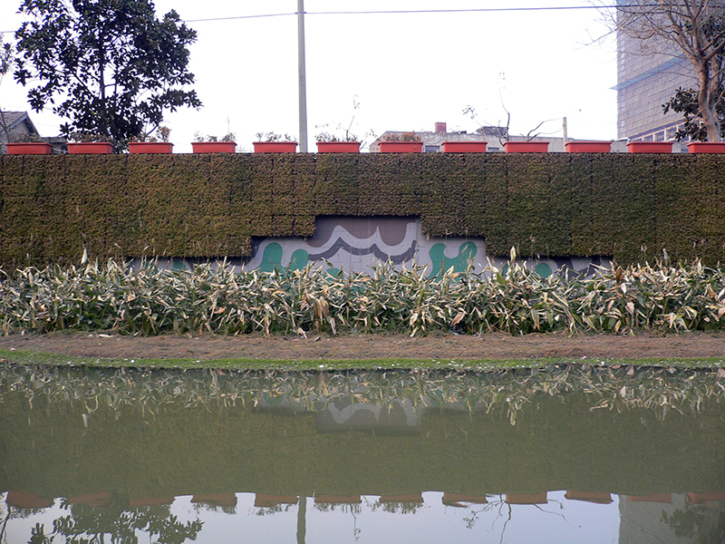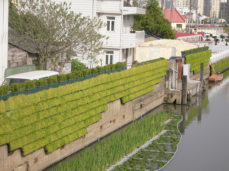 白蓮涇是黃浦江的重要支流之一,白蓮涇河道整治是浦東新區(qū)河道治理的示范性重點(diǎn)工程之一。本工程的設(shè)計(jì)難點(diǎn)在于,如何將兩岸直立破舊的防汛墻與渾濁的水面,進(jìn)行綜合整治與美化。本項(xiàng)目運(yùn)用了我院藤蔓板、綠化模塊等專利技術(shù)。防汛墻上部采用波浪狀布置的佛甲草垂直綠化模塊,在有立地條件的防汛墻下部布置藤蔓板,同上部綠化相呼應(yīng)。防汛墻頂部布置爬山虎掛籃,與墻面綠化連為一體,從整體上有效地綠化、美化和軟化了原有硬質(zhì)直立防汛墻。生態(tài)浮島技術(shù)是本項(xiàng)目的另一個(gè)特點(diǎn)。選用挺水、浮水、匍水三個(gè)層次的水生植物,采用不規(guī)則曲線狀的布置方式,實(shí)行長(zhǎng)短大小不等的多種模塊拼接安裝,錯(cuò)落有致分布在河道駁岸兩邊,神似水邊原生的灘涂。既豐富了水面景觀,又起到凈化水質(zhì)的作用。